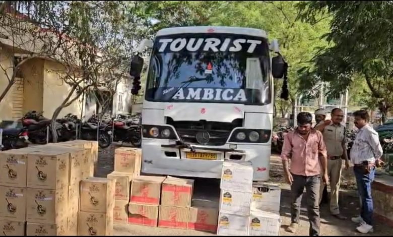 थाना औ. क्षेत्र रतलाम पुलिस द्वारा टूरिस्ट बस में अवैध रूप से ले जायी जा रही अंग्रेजी शराब जप्त