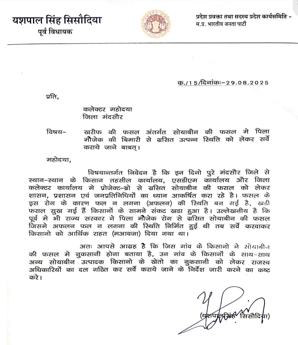 सिसोदिया ने पत्र में उल्लेख किया है कि इन दिनों जिलेभर के किसान तहसील कार्यालयों, एसडीएम कार्यालयों और कलेक्टर कार्यालय में पहुंचकर सोयाबीन की खराब होती स्थिति को लेकर शासन-प्रशासन का ध्यान आकर्षित कर रहे हैं। रोग के कारण फसल में फल न लगने की स्थिति बन रही है और खड़ी फसल सूखने लगी है, जिससे किसानों के सामने गंभीर संकट खड़ा हो गया है।