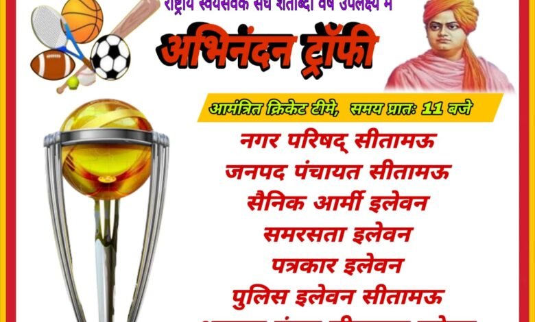 सीतामऊ- खेल महोत्सव अभिनंदन खेल क्लब सीतामऊ के तत्वाधान में “राष्ट्रीय स्वयंसेवक संघ के शताब्दी वर्ष उपलक्ष्य में विजयादशमी पर्व (अभिनंदन ट्रॉफी पुरस्कार) मेत्रीक क्रिकेट प्रतियोगिता एक दिवसीय आयोजन दिनांक 4 अक्टूबर 2025 को श्री राम विद्यालय के खेल मैदान परिसर में प्रातः 11 बजे से आगंतुक अतिथियों जनप्रतिनिधियों की गरिमामय उपस्थिति में भव्य शुभारंभ किया जाएगा,