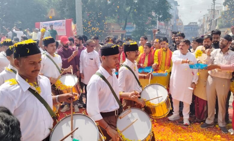 आतिशबाजी से गूंज उठा टैगोर मार्ग, आरएसएस के शताब्दी वर्ष पर निकले पंथ संचलन में उमड़ा सर्व समाज