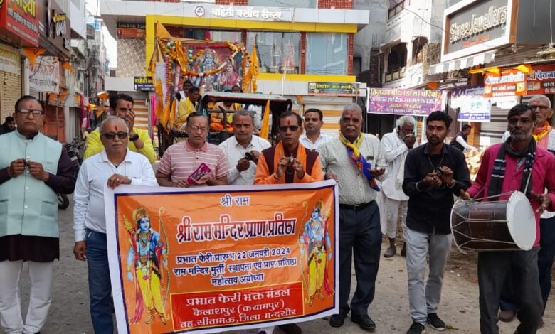 कैलाशपुर 4 जनवरी 2026 / मनासा नगर की श्री राम प्रभात फेरी मंडल के बैनर तले पहली बार मालवा मेवाड़ क्षेत्र के विभिन्न नगरों एवं गांवो से आई हुई प्रभात फेरिया का विशाल धर्मसम्मेलन हुआ जिसमें कैलाशपुर कयामपुर की प्रभात फेरी भक्त मंडल ने भी सहभागिता की।कैलाशपुर चौपाटी पर श्री जगदीश कैलाश चंद्र सेठिया ने प्रभात फेरी सदस्यों का मंगल तिलक किया तथा सुवासरा विधानसभा के विधायक श्री हरदीप सिंह डंग एवं भाजपा मंडल कैलाशपुर के पदाधिकारी गणों ने प्रभात फेरी मंडल के सभी सदस्यों का पुष्पमाला से स्वागत सम्मान कर विदा किया। मनासा नगर की द्वारकापुरी धर्मशाला में 160 नगरों और गांव से आने वाली प्रभात फेरी मंडलों के भक्त जन ढोलक और वाद्य यंत्रों के साथ भजन कीर्तन करते हुए नगर भ्रमण पर निकली जो नगर के विभिन्न मार्गो, बाजार गलियों से होते हुए दोपहर 2:00 बजे कार्यक्रम स्थल द्वारका पुरी धर्मशाला पहुंची।जहां स्वागत द्वार पर सभी प्रभात फेरियों का गुलाल से मंगल तिलक कर पुष्प वर्षा से स्वागत सम्मान किया गया। नगर में सैकड़ो की संख्या में ध्वज पताकाएं फहरा रही थी, पूरे नगर में जगह-जगह स्वागत द्वार, तोरण द्वार और सजावट की गई थी मनासा नगर परिषद, नगर की विभिन्न संस्थाओं और नगर के सामाजिक संगठनों ने नगर में कई जगहों पर मंच बनाकर मंच से शोभायात्रा में सम्मिलित हुए सभी प्रभात फेरी भक्तजनों पर पुष्प वर्षा कर स्वागत सम्मान किया तो नगर जनों ने भी अपने-अपने घरों एवं दुकानों से पुष्प वर्षा कर स्वागत सम्मान कियाl मनासा निवासी और मनासा विधानसभा विधायक श्री माधव मारू ने भी अपने निवास स्थान के वहां पुष्प वर्षा कर स्वागत सम्मान किया तथा विधानसभा में गांव कयामपुर का नाम कैलाशपुर करने बाबत प्रस्ताव रखा था जो मंजूर हुआ तथा प्रभात फेरी के बैनर प्रभात फेरी भक्त मंडल कैलाशपुर नाम देखकर प्रसन्नता जाहिर की।