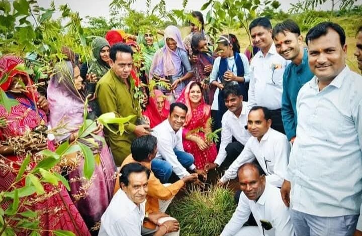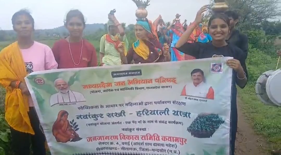 ढोल-मजीरों के साथ अजयपुर खेड़ा में भजन कीर्तन के साथ नवांकुर सखियों कि निकली कलश यात्रा, किया पौधरोपण