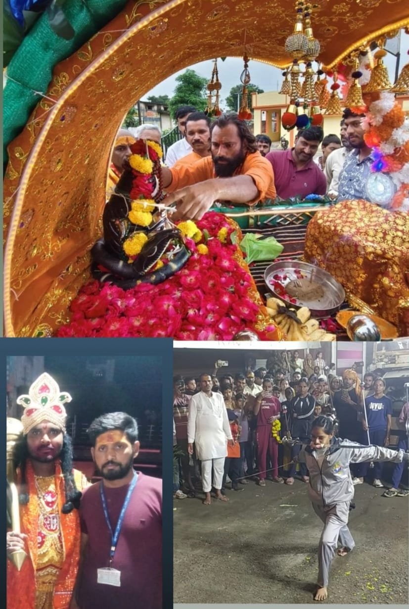 ढोढर। शिव भक्त समिति द्वारा सावन माह के तीसरे सोमवार को भगवान भोलेनाथ की शाही सवारी स्थानीय प्राचीन शिव मंदिर से निकाली गई शाही सवारी मंदिर से प्रारंभ हुई ढोढर ग्राम मोयाखेड़ा रोड क्षेत्र में भ्रमण करते हुए हाट रोड मैदान होकर हंगामा चौक पहुंची पूरा ढोढश्र नगर भोलेनाथ की भक्ति में गूंज उठा हॉट रोड से फोरलेन पर होते हुए कालूखेड़ा फंटा पहुंची शाही सवारी फिर वहां से लौटते हुए शाही सवारी शंकर मंदिर देर रात पहुंची शाही सवारी में भूतों की टोली एवं बजरंग दल के कार्यकर्ताओं ने अपनी कला दिखाई भोलेनाथ शिव पार्वती आकर्षित रंगा रंग झांकीया भी निकाली गई भोलेनाथ की शाही सवारी में साउंड सिस्टम ताशा पार्टी बाहुबली हनुमान अखाड़ा अघोरी सहित विभिन्न धार्मिक प्रतिकृतियों की प्रस्तुति दी ग्राम में भ्रमण के दौरान ढोढर सरपंच जगदीश माली एवं ढोढर पुलिस चौकी समस्त स्टाफ मौजूद रहा