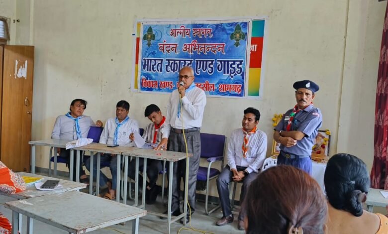 गरोठ- 13/08/25/विकासखण्ड स्तरीय स्काउट गाइड बिगिनर्स प्रशिक्षण का आयोजन शासकीय माडल उ. मा. वि. स्कूल गरोठ में प्रातः 10:00 बजे फ्लेग सेरेमनी (ध्वज शिष्टाचार ) से प्रारंभ किया गया। स्काउट गाइड ईश प्रार्थना दया कर दान भक्ति का हमें परमात्मा देना से प्रारंभ होकर ध्वज लीडर नंदकिशोर शर्मा ने फ्लेग होस्ट (ध्वजारोहण) डेमो स्काउट गाइड बिगनर्स प्रशिक्षण मे उपस्थित प्रतिभागियों को देकर स्काउट गाइड ध्वज गीत “भारत स्काउट गाइड झंडा ऊंचा सदा रहेगा” का सामूहिक गायन किया गया ।
