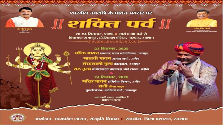 मध्यप्रदेश शासन, संस्कृति विभाग के द्वारा जिला प्रशासन के सहयोग से शारदीय नवरात्रि के पावन अवसर पर 23-24 सितंबर को सायं 6:30 बजे से विधायक सभागृह, इंडस्ट्रियल एरिया बरबड़, रतलाम में शक्ति पर्व का आयोजन किया जा रहा है।