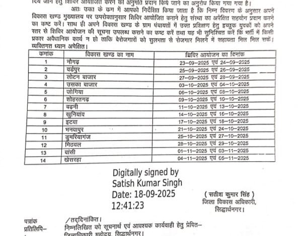 - यह पहल बेरोजगार युवाओं के लिए रोजगार के नए द्वार खोलेगी। इच्छुक युवाओं से अनुरोध है कि वे अपने नजदीकी विकास खण्ड में निर्धारित तिथियों पर शिविर में भाग लें।