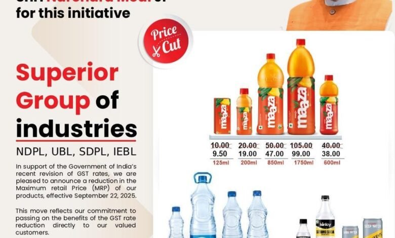 नई दिल्ली, सुपीरियर ग्रुप ऑफ इंडस्ट्रीज़ ने अपने उत्पादों की कीमतों में उल्लेखनीय कमी की घोषणा की है। यह निर्णय ग्रुप की इकाइयों—नर्मदा ड्रिंक्स प्राइवेट लिमिटेड (बिलासपुर, छत्तीसगढ़), सुपीरियर ड्रिंक्स प्राइवेट लिमिटेड (नागपुर, महाराष्ट्र), इंडो यूरोपियन ब्रेवरीज लिमिटेड (औरंगाबाद, महाराष्ट्र), और उदयपुर ब्रेवरीज लिमिटेड (जबलपुर, मध्य प्रदेश)—पर लागू होगा। नई मूल्य सूची 22 सितंबर 2025 से प्रभावी हो चुकी है और इसे सभी डिस्ट्रीब्यूटर, रिटेलर, और फुटकर दुकानों के साथ साझा कर दिया गया है।सुपीरियर ग्रुप के चेयरमैन प्रदीप अग्रवाल और वाइस चेयरमैन विशाल अग्रवाल ने इस कदम के लिए माननीय प्रधानमंत्री द्वारा किए गए ऐतिहासिक GST संशोधन और करों में कमी को श्रेय देते हुए उनका आभार जताया। उन्होंने कहा कि प्रधानमंत्री के दूरदर्शी नेतृत्व के कारण देशवासियों को उच्च गुणवत्ता वाले कोका-कोला उत्पाद अब और भी किफायती दरों पर उपलब्ध होंगे।वाइस चेयरमैन विशाल अग्रवाल ने कहा, “प्रधानमंत्री के नेतृत्व में देश तेजी से प्रगति कर रहा है। सुपीरियर ग्रुप इस विकास यात्रा में आम जनता तक लाभ पहुंचाने के लिए प्रतिबद्ध है।” ग्रुप के सीईओ आशीष सेठी ने ग्राहकों के हितों को सर्वोपरि बताते हुए कहा कि कंपनी उपभोक्ताओं को बेहतरीन अनुभव प्रदान करने के लिए समर्पित है। सीएचआरओ और कॉर्पोरेट अफेयर्स हेड डॉ. सुनील कुमार मिश्रा ने भी प्रधानमंत्री, मंत्रिमंडल, और संबंधित राज्यों के मुख्यमंत्रियों के प्रति आभार व्यक्त किया।सुपीरियर ग्रुप ने यह भी जोर दिया कि उनके सभी उत्पाद पूर्णतः स्वदेशी हैं, भारत में निर्मित हैं, और स्थानीय स्तर पर बड़े पैमाने पर रोजगार के अवसर सृजित कर रहे हैं। यह कदम न केवल उपभोक्ताओं को लाभ पहुंचाएगा, बल्कि स्वदेशी उत्पादन और आत्मनिर्भर भारत के विजन को भी मजबूती देगा।