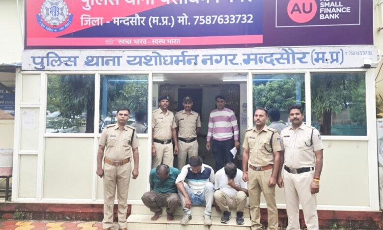 मंदसौर- पुलिस अधीक्षक श्री विनोद कुमार मीना द्वारा कार्यवाही के निर्देशो दिये गये थे जिसके पालन मे अति. पुलिस अधीक्षक श्री तेरसिंह बघेल एवं नगर पुलिस अधीक्षक मंदसौर श्री जितेन्द्र भास्कर के मार्गदर्शन तथा निरीक्षक संदीप सिंह मंगोलिया थाना प्रभारी थाना वायडी नगर के कुशल नेतृत्व में उनि कपिल सोराष्ट्रीय चौकी प्रभारी मुल्तानपुरा व उनकी टीम द्वारा 27.10.2025 को मुखबिर सूचना पर कार्यवाही करते एम.आई.टी. चौराहा, दाऊतखेडी रोड काका टी स्टाल पर 03 व्यक्ति निसार पिता मोहम्मद हुसैन पटेल उम्र 36 साल निवासी नई आबादी बोतलगंज थाना पिपलियामण्डी जिला मन्दसौर, रियाज पिता नन्हे खाँ नियारगर उम्र 38 साल निवासी मस्जिद के पास अँजुमन गली पिपलियामण्डी जिला मन्दसौर तथा दीपक कुमार पिता जमनालाल गर्ग उम्र 42 साल निवासी शमसान घाट के पास, जवाहर नगर थाना प्रतापनगर जिला भिलवाडा राजस्थान के कब्जे से भारतीय मुद्रा जैसे दिखने वाले कुल 76 नकली/जाली नोट 38000/- रूपये मूल्य के जप्त कर आरोपियो को गिरफ्तार कर थाना वायडीनगर पर अपराध धारा 179,180 बीएनएस का पंजीबद्ध कर विवेचना मे लिया गया है।आरोपीयों का पुलिस रिमाण्ड प्राप्त कर भारतीय मुद्रा जैसे दिखने वाले नोटो के स्त्रोतो एवं बेंचने वाले आरोपीयों के संबंध मे सघन पुछताछ की जा रही है।