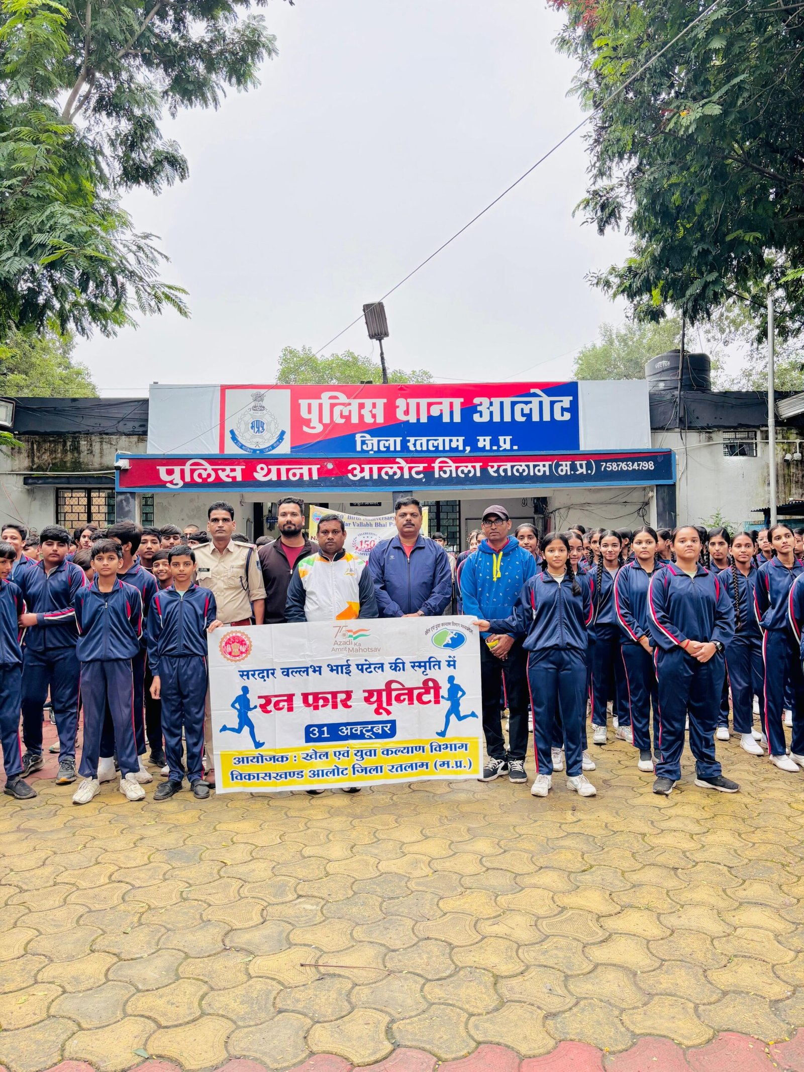 आलोट।जिला खेल और युवा कल्याण विभाग आलोट एवं पुलिस प्रशासन के संयुक्त तत्वाधान मे भारत रत्न सरदार वल्लभ भाई पटेल जी की जयंती पर रन फॉर यूनिटी का आयोजन किया गया।सरदार वल्लभ भाई पटेल जी की 150 वी जन्म जयंती के उपलक्ष्य में रन फॉर यूनिटी, सदभावना दौड़ का आयोजन स्पोर्ट्स के खिलाडी एवं स्कूल के विद्यार्थी उपस्थित रहे, दौड़ का प्रारम्भ पुलिस थाना आलोट प्रांगण से किया गया जो कारगिल चौराहा मार्ग से होती हुई पुनः थाना परिसर में पहुंची ! जहां राष्ट्रगान किया गया एवं राष्ट्रीय एकता की शपथ दिलाई गई।