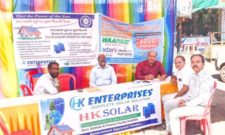सीतामऊ।प्रधानमंत्री सूर्य घर मुफ्त बिजली योजना अंतर्गत सोलर लाइट सोलर गीजर घरेलू सोलर लगवाने हेतु एचके एंटरप्राइजेज नीमच के तत्वाधान में ग्रीन एनर्जी प्राइवेट लिमिटेड कंपनी द्वारा सीतामऊ लदुना चौराहे पर 07 नवंबर शुक्रवार को कंपनी के डायरेक्टर दीपक चतुर्वेदी समन्वयक (काउंसलर) मुफद्दल इस्माइल टेक्निकल इंजीनियर राहुल राजपूत के द्वारा एक दिवसीय कैंप लगाया गया जिसमें बिजली के बिल कि 100 प्रतिशत बचत, सोलर पर अधिकतम सरकारी सब्सिडी, अतिरिक्त सोलर बिजली को ग्रीड में आदान प्रदान, 25 साल से अधिक वर्षों तक का लाभ, प्रदूषण रहित, न्यूनतम ब्याज दर पर ऋण आदि सुविधाएं दी जा रही है।