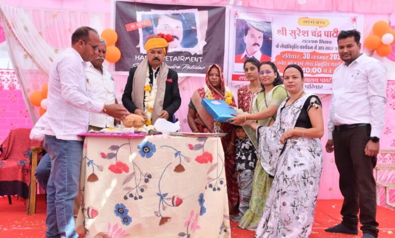 गरोठ- तहसील के शासकीय प्राथमिक विद्यालय ग्रामपावटी अध्यापक सुरेश चंद पाटीदार सेवानिवृत होने पर शाला अध्यापक अध्यापिकाओं स्टॉपशाला स्टॉप द्वारा साफा बंदवा कर शाल श्रीफल से फूल मालाओं से स्वागत करते हुए विदाई दी गई इस अवसर पर अध्यापक डूंगर सिंह चौहान अध्यापक मानसिंह डांगी अध्यापिका किरण से राठौड़ पूजा मेहर पुरि स्टाफ उपस्थित रहा