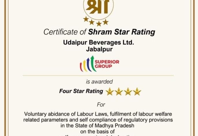 उदयपुर बेवरेज लिमिटेड को मध्य प्रदेश श्रम विभाग से मिला चार-स्टार रेटिंग का सम्मान