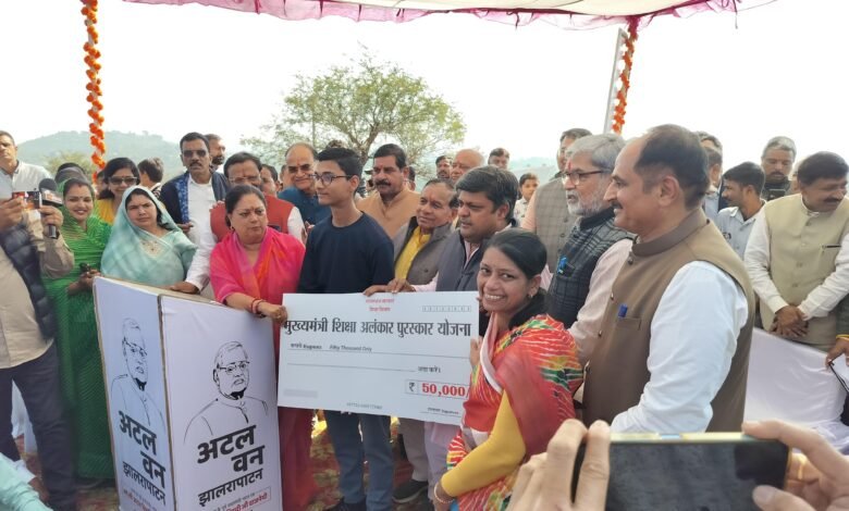 भवानीमंडी ।मुख्यमंत्री शिक्षा अलंकार योजना के तहत श्री सेठ आनंदीलाल पोद्दार राजकीय उच्च माध्यमिक विद्यालय भवानीमंडी के छात्र आयुष जैन पुत्र श्री हेमंत जैन को 25 दिसंबर को लव कुश वाटिका गिंदौर झालरापाटन में आयोजित समारोह में पूर्व मुख्यमंत्री व विधायक झालरापाटन श्रीमती वसुंधरा राजे सिंधिया, सांसद दुष्यंत सिंह द्वारा राज्य सरकार की महती योजना के अंतर्गत ₹50,000 राशि का चेक व प्रमाण पत्र प्रदान किया गया ।