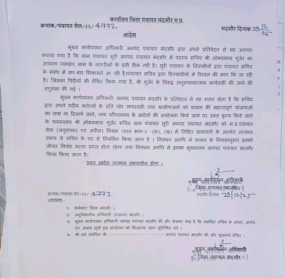 जिला पंचायत मुख्यकारयपालन अधिकारी द्वारा क्रमांक/पंचायत सेल/25/4772 दिनांक 29-12- 2025 को आदेश पत्र जारी किया गया जिसमें कहा गया कि मुख्य कार्यपालन अधिकारी जनपद पंचायत मंदसौर के प्रतिवेदन से यह स्पष्ट होता है कि सचिव द्वारा अपने पदीय कर्तव्यों के प्रति घोर लापरवाही तथा ग्रामीणजनों को शासन की महत्वपूर्ण योजनाओं का लाभ ना दिलाये जाने, तथा वरिष्ठालय के आदेशों की अवहेलना किये जाने पर उक्त कृत्य किये जाने के फलस्वरूप श्री ओमप्रकाश गुर्जर सचिव ग्राम पंचायत सुरी जनपद पंचायत मंदसौर को म.प्र.पंचायत सेवा (अनुशासन एवं अपील) नियम 1999 भाग-2 (क), (ख) में निहित प्रावधानों के अंतर्गत तत्काल प्रभाव से सचिव के पद से निलंबित किया जाता है। निलंबन अवधि में शासन के नियमानुसार इनको जीवन निर्वाह भत्ता प्राप्त होता रहेगा तथा निलंबन अवधि में इनका मुख्यालय जनपद पंचायत मंदसौर किया किया जाता है।उक्त आदेश तत्काल प्रभावशील होगा ।