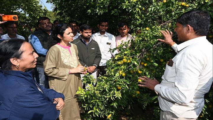 प्रशासन गांव की ओर अभियान के तहत आज ग्राम आक्या खुर्द में किसान चौपाल का आयोजन कर किसानों को खेती की उन्नत तकनीकों की जानकारी दी गई एवं किसानों की समस्याएं सुनकर कलेक्टर श्रीमती मिशा सिंह ने संबंधित विभाग प्रमुखो को निराकरण के लिए आवश्यक निर्देश दिए। कलेक्टर ने ग्राम आक्या खुर्द के उन्नतिशील किसान बनेसिह द्वारा की जा रही संतरे की जैविक एवं रासायनिक खेती का अवलोकन किया। किसान बनेसिंह ने जैविक खेती एवं रासायनिक खेती से होने वाले फायदे, नुकसान की जानकारी किसानों से साझा की। कलेक्टर ने आसपास के अन्य किसानों को संतरे की खेती के लिए प्रेरित करने को कहा एवं उद्यानिकी विभाग को और अधिक किसानों को संतरे के बगीचे लगाने के लिए लक्ष्य बढाने का प्रस्ताव शासन को भेजने के लिए निर्देशित किया।