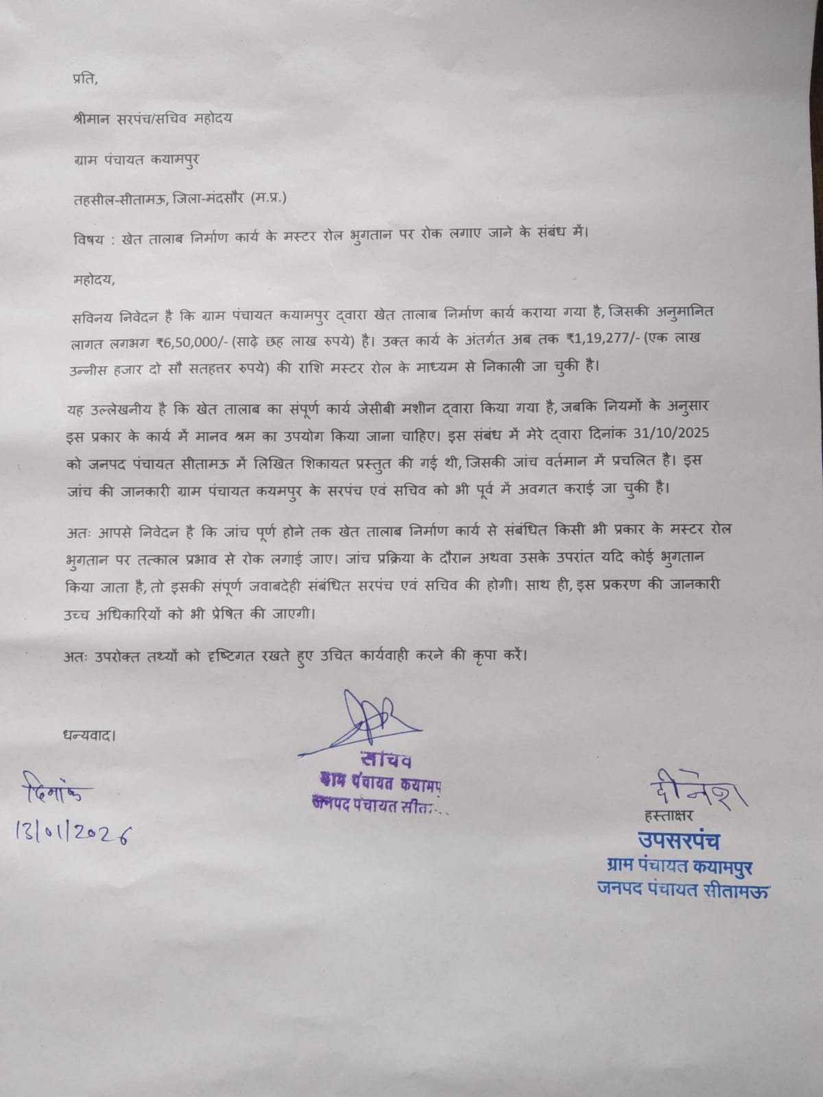 यह उल्लेखनीय है कि खेत तालाब का संपूर्ण कार्य जेसीबी मशीन द्वारा किया गया है, जबकि नियमों के अनुसार इस प्रकार के कार्य में मानव श्रम का उपयोग किया जाना चाहिए। इस संबंध में मेरे द्वारा दिनांक 31/10/2025 को जनपद पंचायत सीतामऊ में लिखित शिकायत प्रस्तुत की गई थी, जिसकी जांच वर्तमान में प्रचलित है। इस जांच की जानकारी ग्राम पंचायत कयामपुर के सरपंच एवं सचिव को भी पूर्व में अवगत कराई जा चुकी है।अतः आपसे निवेदन है कि जांच पूर्ण होने तक खेल तालाब निर्माण कार्य से संबंधित किसी भी प्रकार के मस्टर रोल भुगतान पर तत्काल प्रभाव से रोक लगाई जाए। जांच प्रक्रिया के दौरान अथवा उसके उपरांत यदि कोई भुगतान किया जाता है, तो इसकी संपूर्ण जवाबदेही संबंधित सरपंच एवं सचिव की होगी। साथ ही, इस प्रकरण की जानकारी उच्च अधिकारियों को भी प्रेषित की जाएगी।अतः उपरोक्त तथ्यों को दृष्टिगत रखते हुए उचित कार्यवाही करने की कृपा करें।