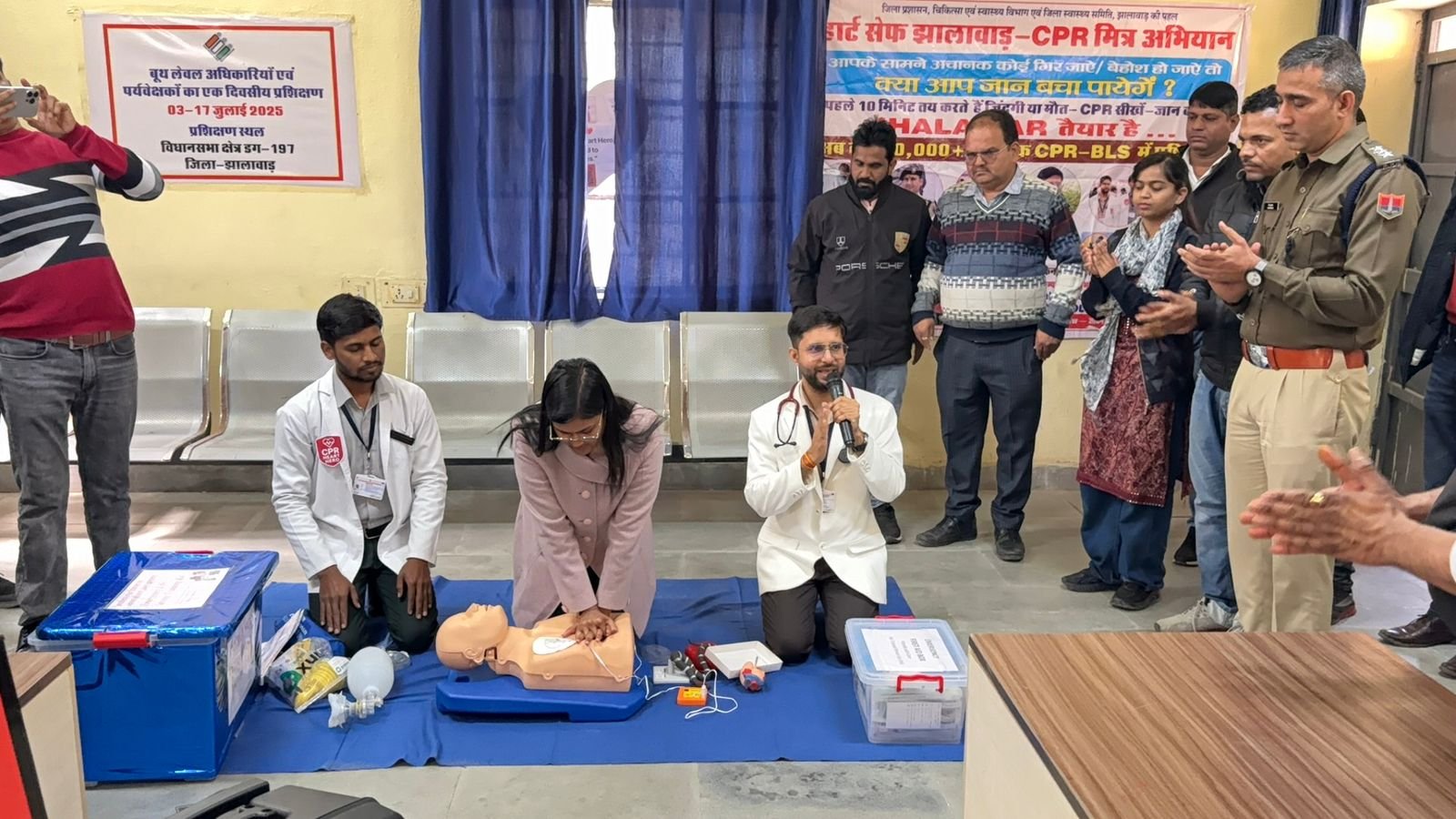 भवानीमंडी । ( जगदीश पोरवाल )मंगलवार को हार्ट सेफ बनाने के लिए ऐतिहासिक पहल करते हुए उपखंड कार्यालय में “सीपीआर मित्र अभियान ” के अंतर्गत एक महत्वपूर्ण सीपीआर, बीएलएस एवं फर्स्ट-एड प्रशिक्षण कार्यशाला का आयोजन किया गया । झालावाड जिले में 25,000 से अधिक नागरिकों को सीपीआर में प्रशिक्षित किया जा चुका है,जिला कलेक्टर श्री अजय सिंह राठौड़ के निर्देश एवं सीएमएचओ डॉ. साजिद खान तथा बीसीएमओ डॉ. सुनील मीणा के मार्गदर्शन में भवानीमंडी उपखंड कार्यालय में ‘हार्ट सेफ झालावाड़ – सीपीआर मित्र अभियान’ के अंतर्गत एक महत्वपूर्ण सीपीआर, बीएलएस एवं फर्स्ट-एड प्रशिक्षण कार्यशाला का आयोजन किया गया। कार्यक्रम की अध्यक्षता एसडीएम श्रद्धा गोमे (आईएएस) ने की।