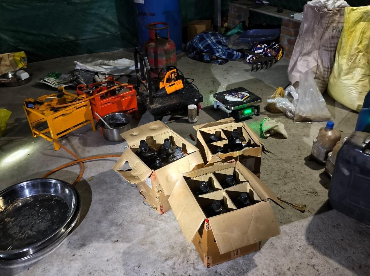 पुलिस ने भारी मात्रा में निर्माण सामग्री व उपकरण, केमीकल एवं अवैध मादक पदार्थ एमडीएम को किया जप्त किया :-