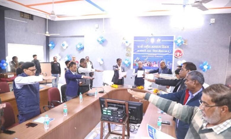नीमच-अपर कलेक्टर श्री बी.एस. कलेश की अध्यक्षता में 25 जनवरी 2026 को 16वां राष्ट्रीय मतदाता दिवस समारोह जिला पंचायत सभाकक्ष नीमच में आयोजित किया गया। इस अवसर पर एसडीएम श्री संजीव साहू,डिप्टी कलेक्टर श्री पराग जैन,श्री चंद्रसिंह धार्वे,सुश्री श्रुति भयडिया सहित जिला अधिकारी विभिन्न विभागों के अधिकारी-कर्मचारीगण उपस्थित थे।