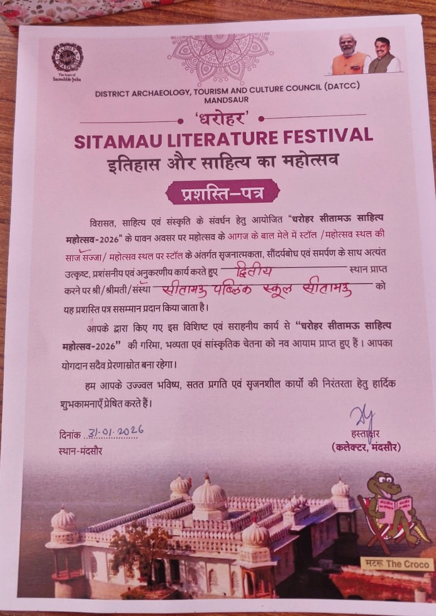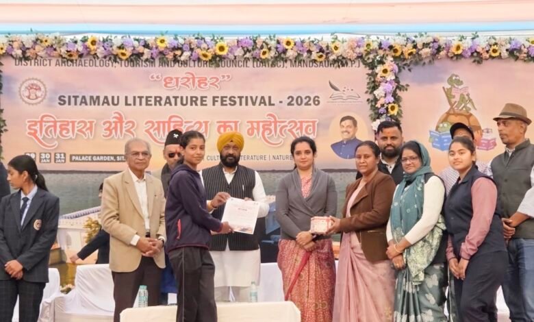सीतामऊ। नटनागर शोध संस्थान में 29 से 31 जनवरी 2026 तक आयोजित द्वितीय सीतामऊ साहित्य महोत्सव का आज सफल एवं गरिमामय समापन हुआ। समापन अवसर पर सीतामऊ पब्लिक स्कूल को आगाज के बाल मेले में स्टॉल और महोत्सव स्थल पर स्टॉल लगाने पर प्रथम स्थान मिला और महोत्सव स्थल पर साज सज्जा में द्वितीय स्थान पर रहा। जिसको कलेक्टर श्रीमती अदिती गर्ग, शिवानी गर्ग, विधायक महोदय हरदीपसिंह डंग और उपस्थित अतिथियों द्वारा सम्मानित किया गया।