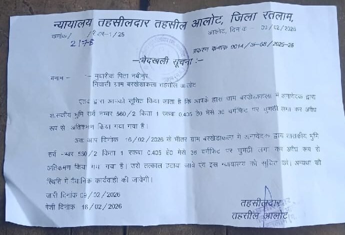 अब तहसीलदार पंकज पवैया की कार्यप्रणाली पर सवाल उठाते जा रहें हैं आखिर क्यों विवश हैं स्कूल परिसर से लगी दुकानों कों हटाने में अतिक्रमणकर्ता ने विधालय को चहुंओर से घेर रखा है जिससे छात्र छात्राओं को स्कूल में प्रवेश व निकास के दौरान परेशानी का सामना करना पड़ता है। जिसकी लिखीत शिकायत एसडीएम कार्यालय में करने के बाद भी तहसीलदार पंकज पवैया ने इसे गंभीरता से नहीं लिया उल्टे शिकायतकर्ता को पंचायत नियमों का ज्ञान देते हुए उक्त अतिक्रमण भूमि ग्राम पंचायत की बताकर अपनी कर्तव्य से विमुख हो गए जबकि कि आलोट तहसील कार्यालय द्वारा बरखेड़ा कला स्कूल परिसर के अतिक्रमणकर्ता कों हटाने का सूचना पत्र क्रमांक/2178 रीडर – 1/25 दिनांक 9/02/2026 प्रकरण क्रमांक 00141अ 68/2025-26 ग्राम पंचायत बरखेड़ा में शासकीय भूमि सर्वे नम्बर 560/2 किता 1 रकबा 0405 पर व्यावसायिक अतिक्रमणकर्ताओं द्वारा विधालय सीमा में गुमटी लगाने पर नोटिस जारी किया गया किन्तु आज तक कोई कार्रवाई तहसीलदार पंकज पवैया नहीं कर पाए मात्र नोटिस जारी कर इतिश्री कर ली गई। अब सवाल यह उठता है कि जिस जगह अतिक्रमणकर्ता ने अपना अतिक्रमण कर रखा है वह भूमि ग्राम पंचायत बरखेड़ा कला की हैं तो तहसीलदार द्वारा इनको नोटिस क्यों दिया जाता और हर वर्ष भूमि टेक्स क्यों लिया जाता है।‌ सवाल यह है कि जब आदर्श ग्राम पंचायत का दर्जा प्राप्त क्षेत्र में यह हाल है तो अन्य गांवों की स्थिति का अंदाजा लगाया जा सकता है। अब देखना यह है कि जिला कलेक्टर आलोट तहसीलदार पंकज पवैया की किलास लेकर स्कूल परिसर सीमा में गुमटी तथा दुकानों के अतिक्रमण को हटाने की कार्रवाई करेगी।