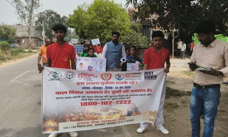 गोरखपुर कैंम्पियरगंज अक्षय तृतीया के पावन अवसर पर बाल विवाह मुक्त भारत अभियान के अंतर्गत मानव सेवा संस्थान द्वारा जनपद गोरखपुर के ब्लॉक कैंपियरगंज अंतर्गत मोदीगंज में व्यापक जन जागरूकता रैली का आयोजन किया गया।रैली में बच्चों ने उत्साहपूर्वक भाग लिया और बाल विवाह के खिलाफ जोरदार नारे लगाए। बच्चों ने “बाल विवाह बंद करो, शिक्षा का अधिकार दो”, “बेटी बचाओ, बेटी पढ़ाओ, बाल विवाह मुक्त भारत बनाओ” जैसे नारों से पूरा क्षेत्र गूंज उठा।मानव सेवा संस्थान के पूर्व मयंक त्रिपाठी ने रैली में शामिल होकर कहा, “बाल विवाह एक घातक कुप्रथा है, जिसके कारण लड़कियों की शिक्षा अधूरी रह जाती है और उन्हें शारीरिक, मानसिक एवं सामाजिक समस्याओं का सामना करना पड़ता है। हमें इस कुरीति को जड़ से मिटाना होगा और बाल विवाह मुक्त भारत का सपना साकार करना होगा।” रैली में संस्थान के कार्यकर्ता कन्हैया कुमार यादव, पूनम यादव और संदीप कुमार भी उपस्थित रहे और रैली को सफल बनाने में सक्रिय भूमिका निभाई।यह रैली बाल विवाह जैसी सामाजिक कुरीति के खिलाफ जागरूकता फैलाने और समाज को संवेदनशील बनाने की दिशा में एक महत्वपूर्ण कदम साबित हुई। मानव सेवा संस्थान ने भविष्य में भी ऐसे कार्यक्रमों को जारी रखने का संकल्प लिया है।