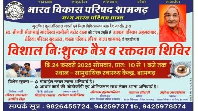 निःशुल्क नेत्र परीक्षण मोतियाबिंद शिविर एवं रक्तदान शिविर 24 फरवरी को शामगढ़ । नगर की अग्रणी सामाजिक सेवाभावी संस्था भारत…