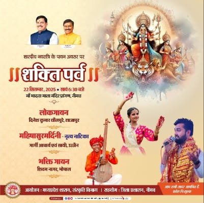 नीमच 21 सितंबर 2025।* संस्कृति विभाग, म.प्र. शासन द्वारा शारदीय नवरात्रि के पावन अवसर पर “शक्ति पर्व” का आयोजन 22 सितंबर, 2025 को सायं 6.30 बजे से माँ भादवा माता मंदिर में किया जाएगा। इस प्रदेश स्तरीय महोत्सव में लोक-भक्ति गायन और आदि शक्ति को समर्पित नृत्य नाटिका के माध्यम से देवी के वैभव और महिमा को विभिन्न कला रूपों के माध्यम से प्रदर्शित किया जाएगा।